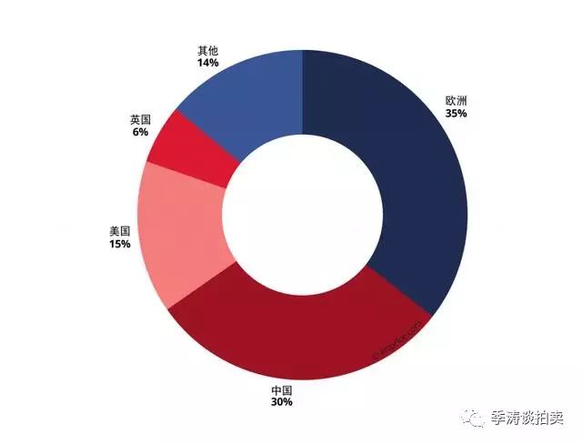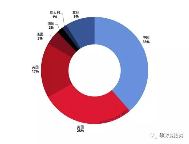 2016年全球拍卖交易额总计124.5亿美元,售出675500件拍品,西方售出拍品数量增长11%,96%的拍品的出售价格不超过50000美元。其中,中国拍卖成交额48亿美元,售出91400件拍品,美国排名第二,2016年成交额为35亿美元,售出72500件拍品,英国位居第三,在全球拍卖交易额中占有17%的份额,香港排在第四位,成交额11.5亿美元。
