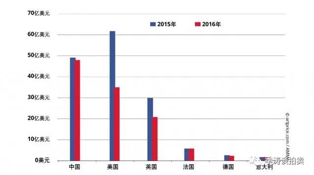 据法国艺术品行情公司Artprice发布报告称,2016年全球艺术销售额暴跌,而中国重新回到第一的位置上。自从2010年中国占据世界艺术品成交第一的宝座后,雄霸了这一位置5年,2015年又输给了美国,排在第二位,不过2016年又夺了回来,拍卖销售额高达48亿美元,占世界总成交额的38%。
