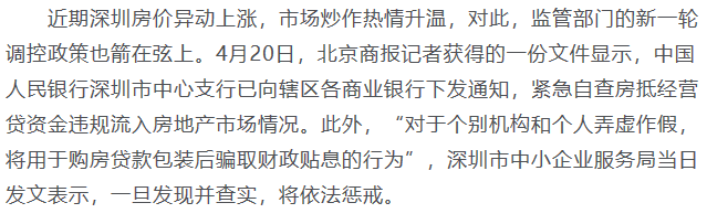 3个月前,4月20日,同样是为了防止非合规资金流入楼市,央行启动了对经营贷炒房的严打,对“劣迹明显”的深圳,更是敲打猛烈(如下图)。