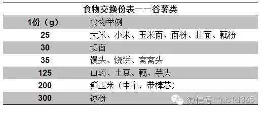 注:一个主食类食物交换份可产生376kJ(90kcal)能量,其中含有糖类20g,蛋白质2g,脂肪0.5g。