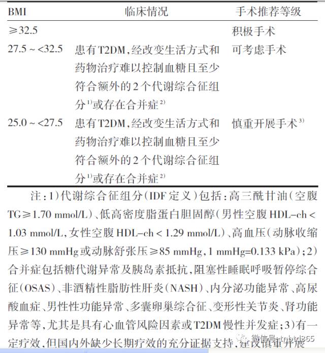 这几年国内外都发表了不少有关减肥手术治疗2型糖尿病的指南或规范,随着研究的深入,该方法已经得到普遍的认可,但必须把握好适应证和禁忌证。一开始的时候,减肥手术只用于严重肥胖的2型糖尿病患者,这几年适用人群在不断扩大,例如美国糖尿病协会(ADA)的2017版诊疗指南除了将原来的“减肥手术(bariatric surgery)”改称“代谢手术(metabolic surgery)”,还将体质指数(BMI)切点从2016版指南的≥35kg/m2降至≥30 kg/m2(亚裔美国人切点为≥27.5kg/m2)。下图为《中国肥胖和2 型糖尿病外科治疗指南(2014)》的手术治疗2型糖尿病入选标准。