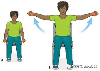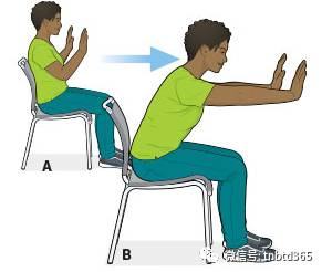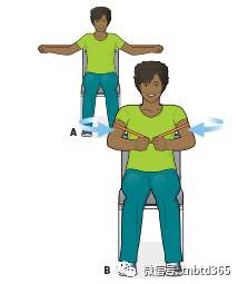 A. 坐在椅子上,背靠椅子,双腿分开,与肩同宽。吸气,抬起前臂置于胸前,双手掌心向前。