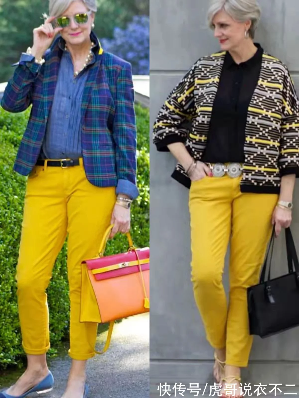 这是因为彩色系下装离我们的脸比较近,高饱和度彩色系对脸部的影响很小,就算是肤质不佳甚至满脸皱纹的白发奶奶,也可以展现出更美的一面。