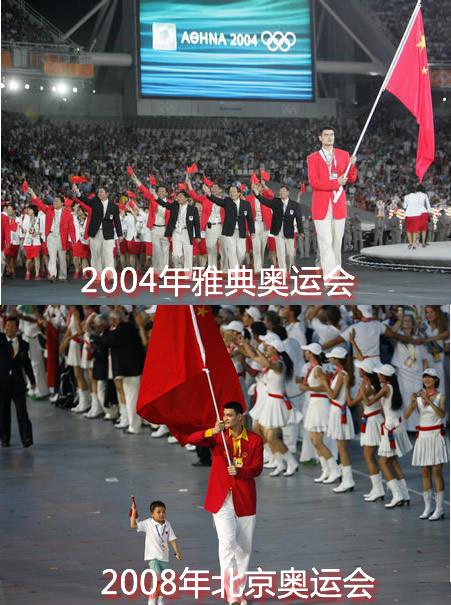 【第28、29届奥运会旗手姚明】参加过2000年悉尼奥运会的姚明成为28和29届奥运会中国代表团旗手。在雅典,姚明场均贡献20.7分9.3篮板,带领中国男篮取得第八名的成绩。 2008年在家门口举行的奥运会,姚明克服左脚踝应力性骨折的困扰,在奥运前夕伤愈复出,并再一次成为中国奥运代表团的旗手,姚明再一次将中国男篮带入前八。