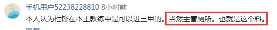 球迷希望杜锋不回来的同时,给他指明了去向,有的建议他去当俱乐部饭堂主任;有的建议他去养猪;有的建议他去当城管;有的建议他当保安、更夫或是管厕所(下见截图)