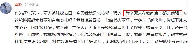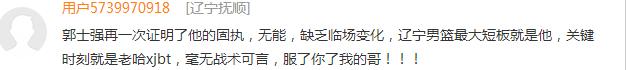 比赛结束后,网上一派骂声,大批郭士强无能,可以说郭士强处在风口浪尖上。辽宁球迷没有给面子于郭士强:“今天我就是来喷郭士强的,放个死人在教练席上都比他强”,“辽宁最大短板就是郭士强!其次廉明!”,“郭士强再一次证明了他的固执,无能,缺乏临场变化,辽宁男篮最大短板就是他,”(下见截图)