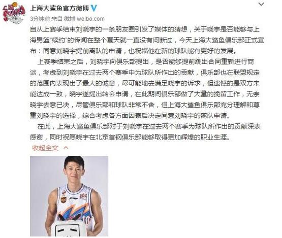 上海队的声明指出:刘晓宇向俱乐部提出,是否能够提前跳出合同重新进行商谈,考虑到刘晓宇在过去两个赛季中为球队所作出的贡献,俱乐部也在联盟规定的范围内表现出了最大的诚意,尽可能地去满足晓宇的诉求,但遗憾的是双方未能达成一致。声明中还不忘给刘晓宇送上祝福:上海大鲨鱼俱乐部对于刘晓宇在过去两个赛季为球队所作出的贡献深表感谢,同时祝愿晓宇在北京首钢俱乐部能够取得更加辉煌的职业生涯。