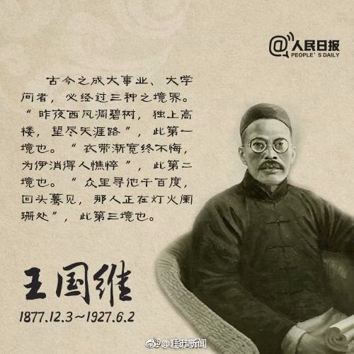 王国维的三境界之说,引用了三位中国著名词人的三首词来表达,这个表达非常别致、优美,也是三种美学境界。
