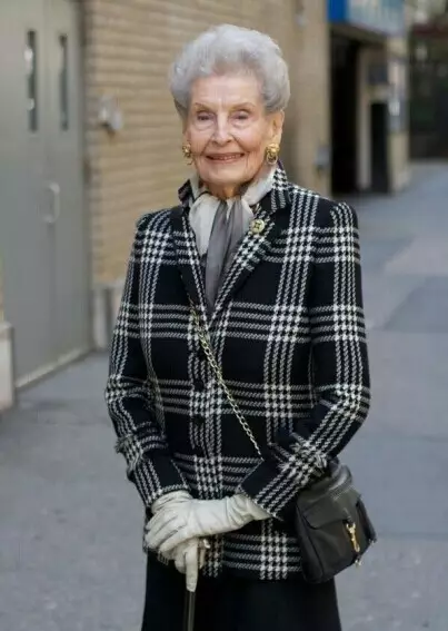 毫不佝偻的腰身足够配的上精致裁剪的小西装,气场十足。没人会猜到此老太被美好精致的外在藏起来的年龄为整整100岁。