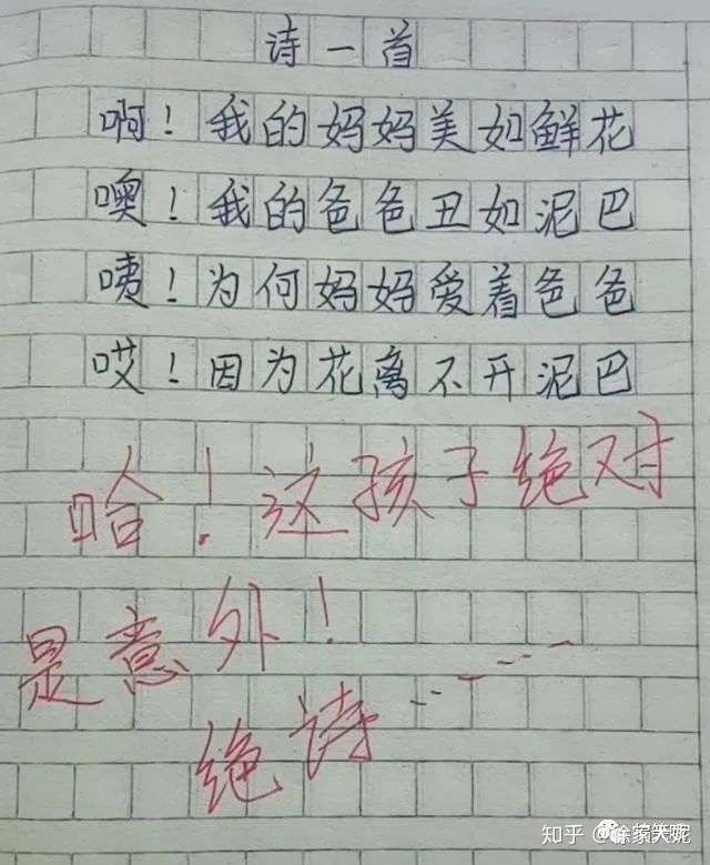 这位小学生直接是写《诗一首》,称妈妈美如鲜花,而爸爸丑如泥巴,而之所以妈妈爱爸爸,是因为花离不开泥巴。说得还是很有道理的,只是爸爸看了不知作何感想。