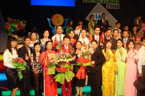 5 月11 日 ,让所有越南经销商盼望已久的一天终于到来了。来自河内、清化、老街、岘港、广宁等地的经销商身穿盛装,满怀喜悦的心情早早地就赶到会场。在十点钟(越南时间)伴随着热烈掌声,会议正式开始,YOUNEED 经销商们手持小司旗尽情地摇动着。当会议主持人念到获奖企业YOUNEED 时,大屏幕上显现出“YOUNEED ”国际标志,集团董事长许泽锐先生神采飞扬、迈着矫健的步伐走向领奖台中央,全场立即响起一阵阵热烈的掌声,在欢呼和旗海的呼应中,许董接过闪耀的奖杯。