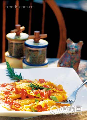 特点:瘦身、降压。意面的原料是硬小麦,既含丰富蛋白质,又含复合碳水化合物,而后者在人体内分解缓慢,不会引起血糖迅速升高。同时,意面还可刺激咀嚼易于消化,非常适合减肥的人食用。番茄富含丰富的胡萝卜素、B 族维生素和维生素C,维生素P 含量是蔬菜之冠,对心血管具有保护作用,有益降压、抗氧化。