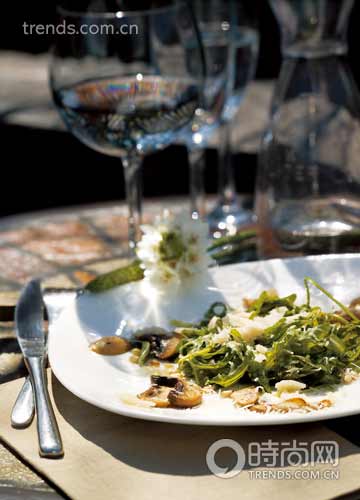 材料:芝麻菜50g、牛肝菌30g、松仁10g、沙拉汁10g、盐1g、黑胡椒1g、帕玛森奶酪10g。