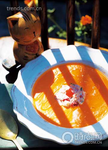 特点:消暑、抗氧化。一道清润的冷汤,让夏日的暑气瞬间消散。番茄、甜椒、黄瓜、洋葱等多种蔬菜带来的丰富维生素C、β- 胡萝卜素等,不仅能有益美容抗氧化,还具有清脂瘦身的功效。