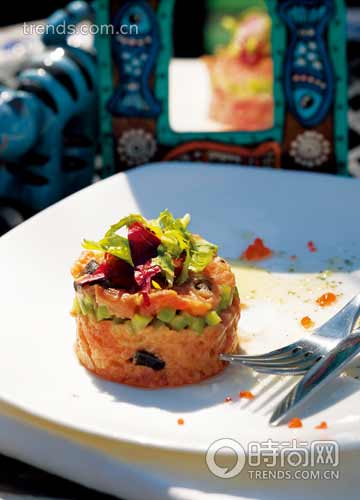 4. 鱼肉青椒丁放入盘中,拿走模具,再用红鱼子、橄榄油酱装饰。