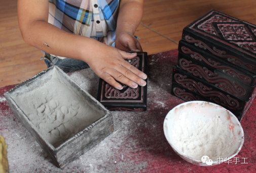 漆器上没有推光的部分粗糙古拙,而推光后的部分则光洁如新。经何俊明介绍,原来用来打磨推光的细粉是用从老房子拆下的灰砖碾成的。细腻的砖粉,掌心的温度,适当的力度和无数次的打磨,才会在漆器上留下莹润的光泽。神奇的是,这种光泽会随着时间的推移越来越润泽,历久弥新。“推光通常都是由较胖的女孩子来做,一是因为她们手上的肉比较厚,二是因为掌纹细,推光的效果会更好。”