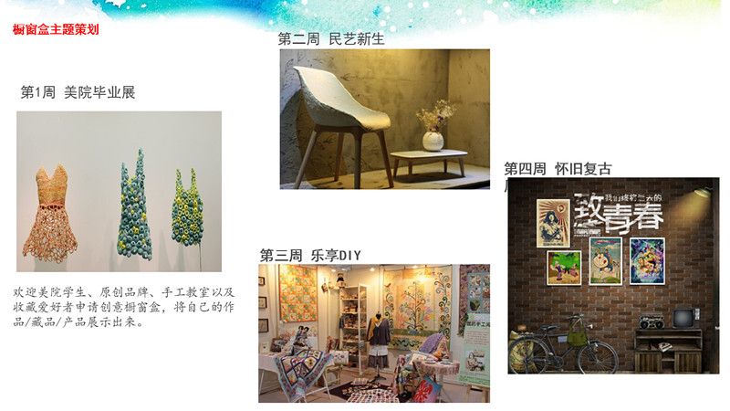 本次市集为了突出原创与艺术,专门打造了4个创意橱窗盒,可供原创品牌做品牌宣传、艺术工作者做艺术展览用,欢迎申请,费用为大盒子2000元,小盒子1500元(1周时间)。