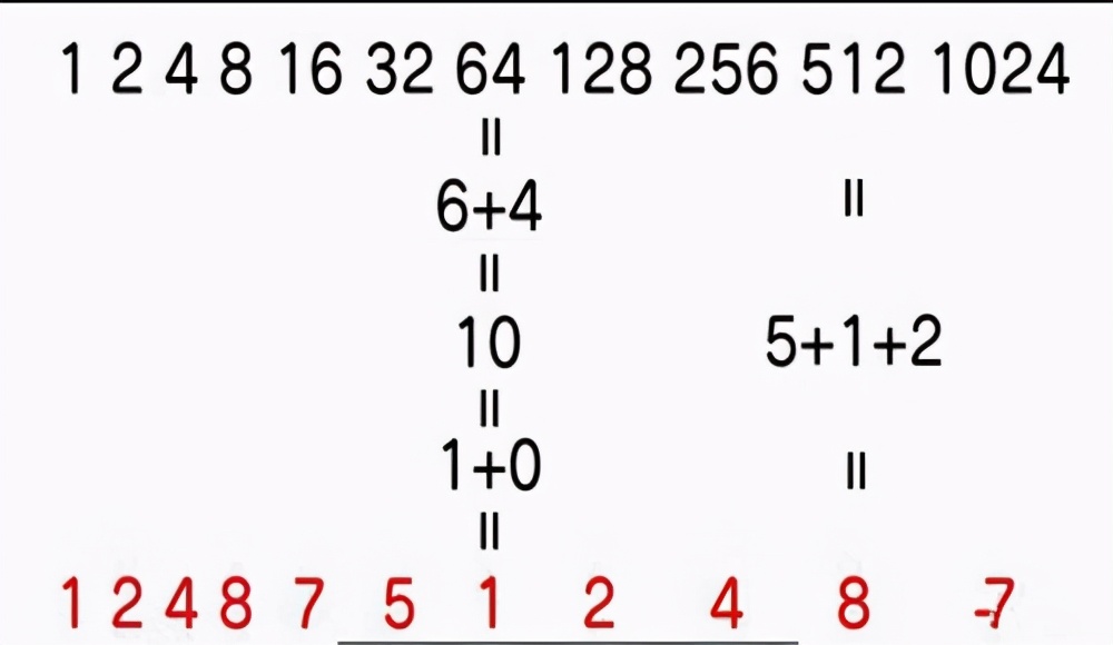 根据细胞分裂模型,一分为二,二分为四,以此类推。数字是1,2,4,8,16,32...,而且排列是无限的。但是不管有多无限,有一个很奇怪的规律,就是把个位数加起来,直到只剩下最后一个数,你就会得到一个长数列——124875124875。