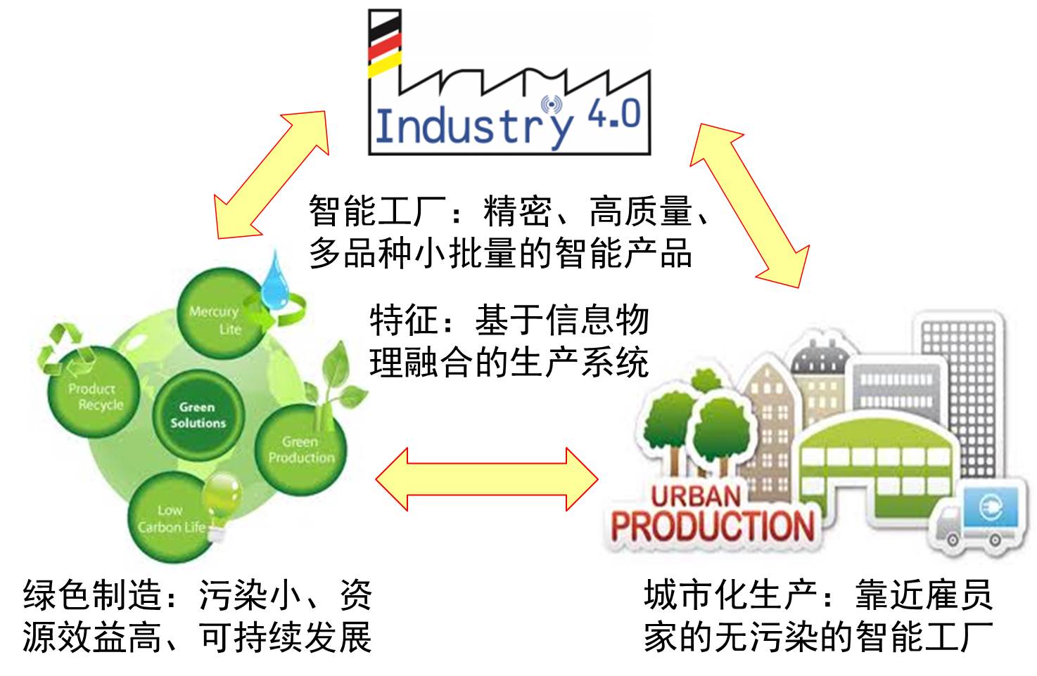 即将到来的工业4.0第一个内涵就是智能化、绿色化和人性化,每个人或每个客户的需求是不一样的,个性化或定制化的产品不可能大批量生产。工业4.0必须解决的第一个问题是,单件小批量生产要能够达到大批量生产同样的效率和成本,构建能生产精密、高质量、个性化智能产品的智能工厂。绿色化包括产品全生命周期,无论产品的制造、使用和废弃过程对环境的污染小、碳排放低,可回收再用和循环,从而实现可持续发展。由于环境友好,绿色化生产是在花园式工厂中进行的,可以建在城市里、靠近工作人员的家,减少上下班交通的时间浪费和能源消耗,大大改善了生产与环境和人的关系,如图1所示。