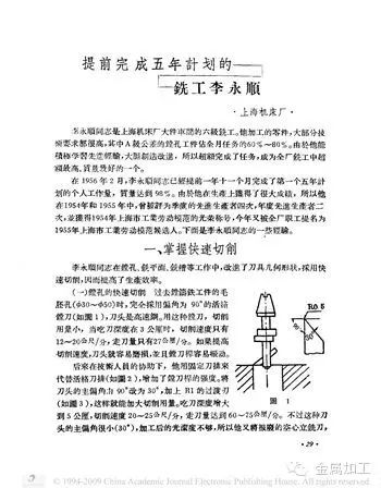 李永顺是上海机床厂大件车间的铣削能手,是盛利的师傅。他积极学习先进经验,大胆创造改进,超额完成任务,“成为全厂铣工中超额最高、质量最好的一个”。上海机床厂撰文《提前完成五年计划的铣工李永顺》(见图3)介绍了他的生产实践经验,发表在《机械工人》1956年第6期。