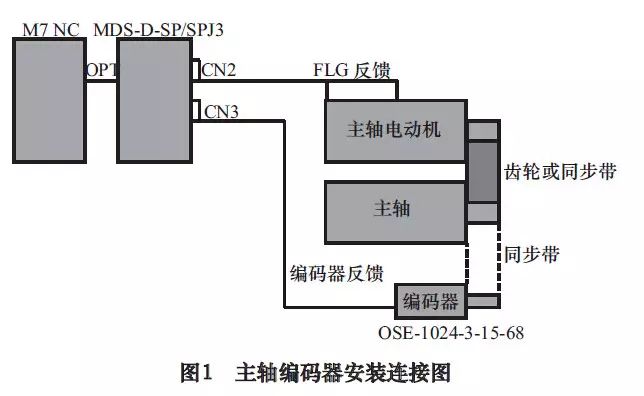 从图1可以看出,主轴电动机与主轴之间可以通过齿轮或同步带相连接。但是主轴与外置编码器之间要求用“同步带”连接。这是为了保证主轴与编码器之间“旋转方向相同,转速相同”。如果主轴与编码器之间是齿轮连接,也要通过加装“中间过渡齿轮”达到“旋转方向相同,转速相同”的要求。