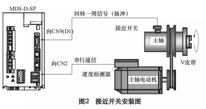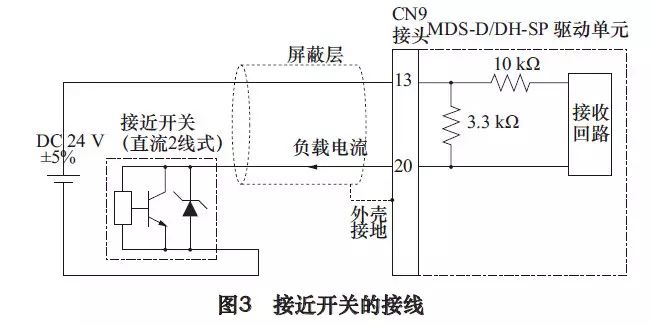 感应块应该与主轴刚性1:1连接,其感应信号引出线应该连接于主轴驱动器的CN9口。接近开关的接线如图3所示。