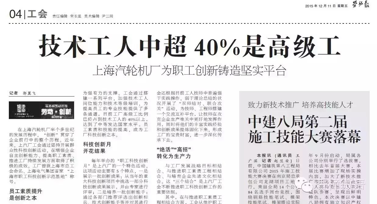 《劳动报》报道上海汽轮机厂劳动创新新闻