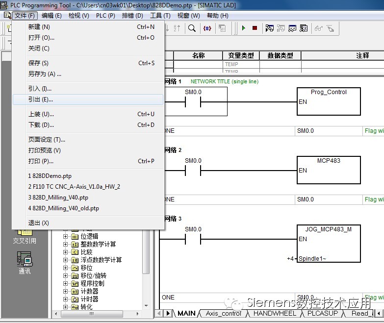 配置828D系统机床发到用户处后,如果有PLC的相关问题,我们应该怎么办呢?原来802Dsl系统如果想修改PLC的话,可以生成一个*.pte的文件,然后让客户传入系统就可以了。828D上就没有这个文件了,但也可以实现这个功能,注意新的4.5版本后的Toolbox中的PLC programming tool的版本是V3.2.4.8或者以上的,都可以在程序的文件引出功能那生成*.ard格式的PLC,然后将*.ard文件传入828D即可,如下图。