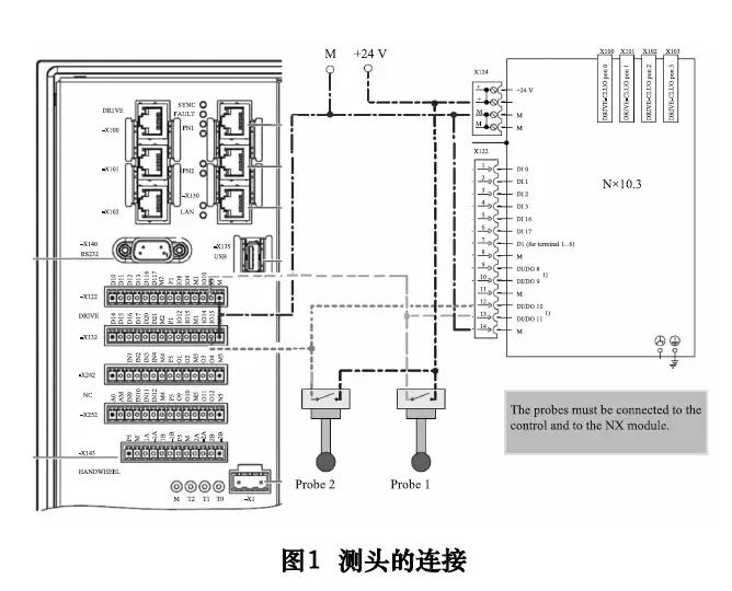 西门子828D工件自动测量功能是选项,不激活该选项,无法在程序中编辑测量循环。客户想使用该项功能,需购买此选项。828D系统可连接两个测头,测头的检测信号一般连接到SINMERIK 828D PPU上,如果828D系统配有扩展模块NX10,也可以连接在NX10上。第一测量信号接到:PPU上 X 122 pin 13或者NX10上X122 pin 13,如果有第二测量信号需连接到:PPU上 X 132 pin 13或者NX10上X122 pin 12,连接方法如图1所示。