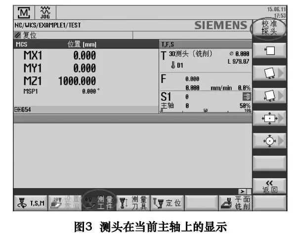 工件测头的标定是利用环规或镗过的孔作为基准来确定测头的长度和直径。首先在828D系统刀具表里创建一把3D测头刀具,并且使该刀具装载在当前主轴上,如图3所示。