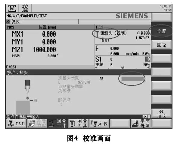 在图3的画面上点击“校准探头”软按键,就进入图4的校准画面。在此画面中首先输入长度方向的相关参数,然后按机床控制面板上的“循环启动”按键,对测头长度校验,得到的参数自动存入828D系统。测头半径校准步骤与长度校准步骤一样,在半径测量的过程中,探头共测量两遍,第一遍测完后,主轴旋转180°,然后继续测量。