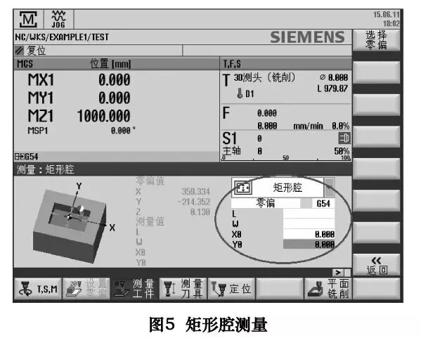 进入图3的界面,选择右侧的垂直按键,进入图5的 “矩形腔”测量界面,在图5的人机界面中输入相关的参数后按“循环启动”按键,便可以实现“矩形腔”中心点测量,测量结果放在零点偏置G54中。西门子828D还有丰富的测量循环能够充分满足各种加工工艺的在线测量要求,用户可以参考相关的手册,当然用户也可以自己编写测量循坏程序。