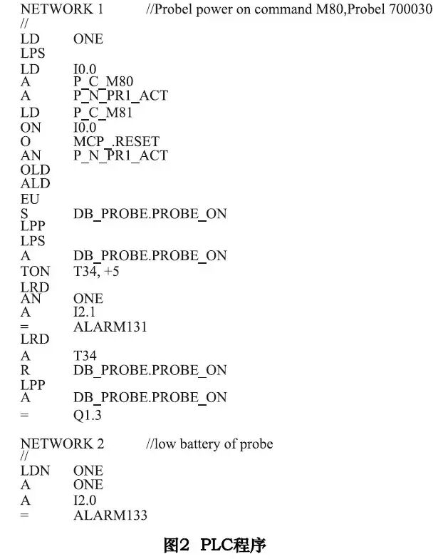 图2的PLC程序中,用M代码M80打开测头,M81来关闭测头,12.0来检测测头的电压,如果电压不正常就报警。