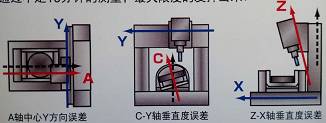 d、大隈推出的五轴调和功能也是典型的一种智能技术。在五轴联动加工中心中,当加工异形曲面时,瞬时旋转轴与直线轴的相对位置变化,难免对精度产生影响,比如旋转轴与直线轴的中心偏差,旋转轴与直线轴的垂直度偏差等。