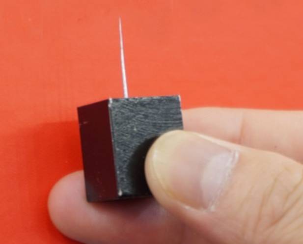 E2-291展台,帝马数字机器(深圳)的VBZ640立加,这台BT40主轴的机床,正以4000r/min转速,把一块15mmΧ15mm的钢件,铣削成一根Φ0.7mmΧ25mm长的一根针。