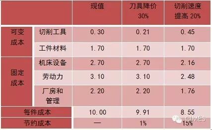 虽然刀具占比不大,但是其带来的效率和最终单件成本影响却是很大的。如下图所示,降低刀具价格和提高刀具切削速度都可为金属加工作业节约1%~15%的成本。