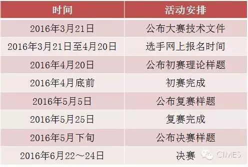 比赛分为初赛、复赛和决赛三个阶段。初赛和复赛理论知识比赛在网上进行,决赛在第十三届中国国际机床工具展览会上(2016年6月22至26日,北京顺义新国展)进行。