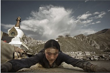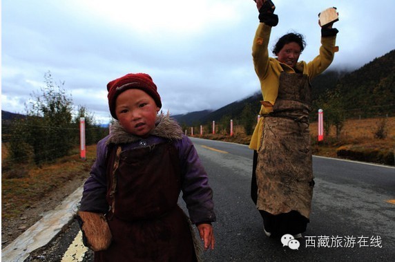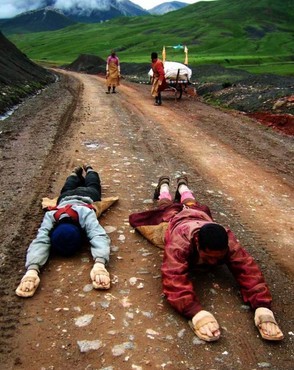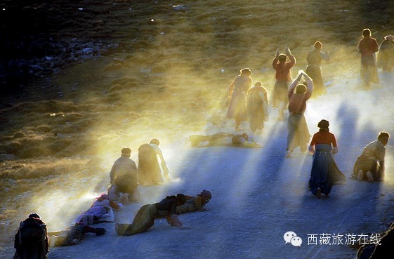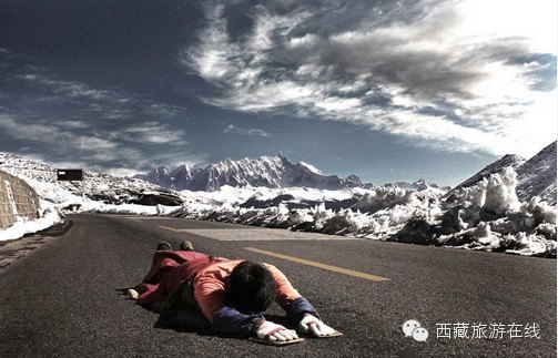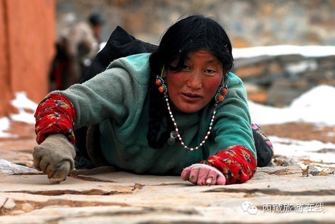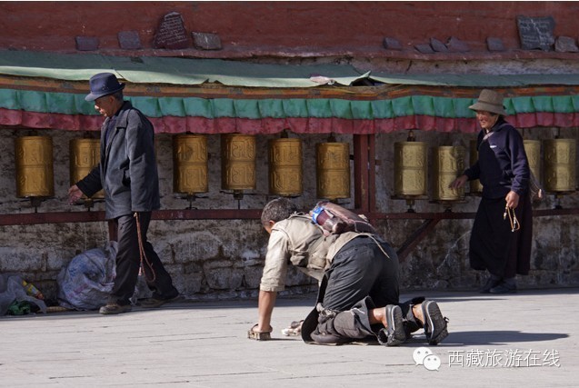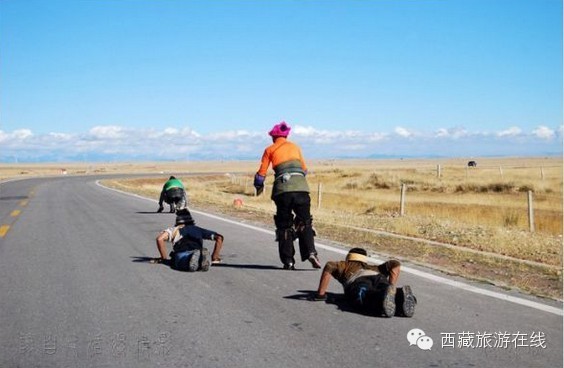 磕头朝圣的人在其五体投地的时候,是为“身”敬;同时口中不断念咒,是为“语”敬;心中不断想念着佛,是为“意”敬。