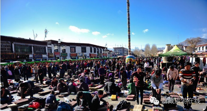 每天清晨,晨雾尚未散尽,在一片雾霭朦朦中,寺前香火缭绕,众多信徒无论酷暑严寒,忍饥挨饿,一步一个长头磕到大昭寺释迦牟尼这尊等身像下,就是为了表达他们对自己信仰的极度虔诚,其中有些人甚至抛尸荒野也在所不惜。有些信徒,终其一生只有一个愿望,就是能亲自到这座佛象前,祈求佛祖的庇佑。
