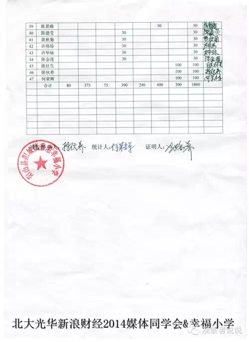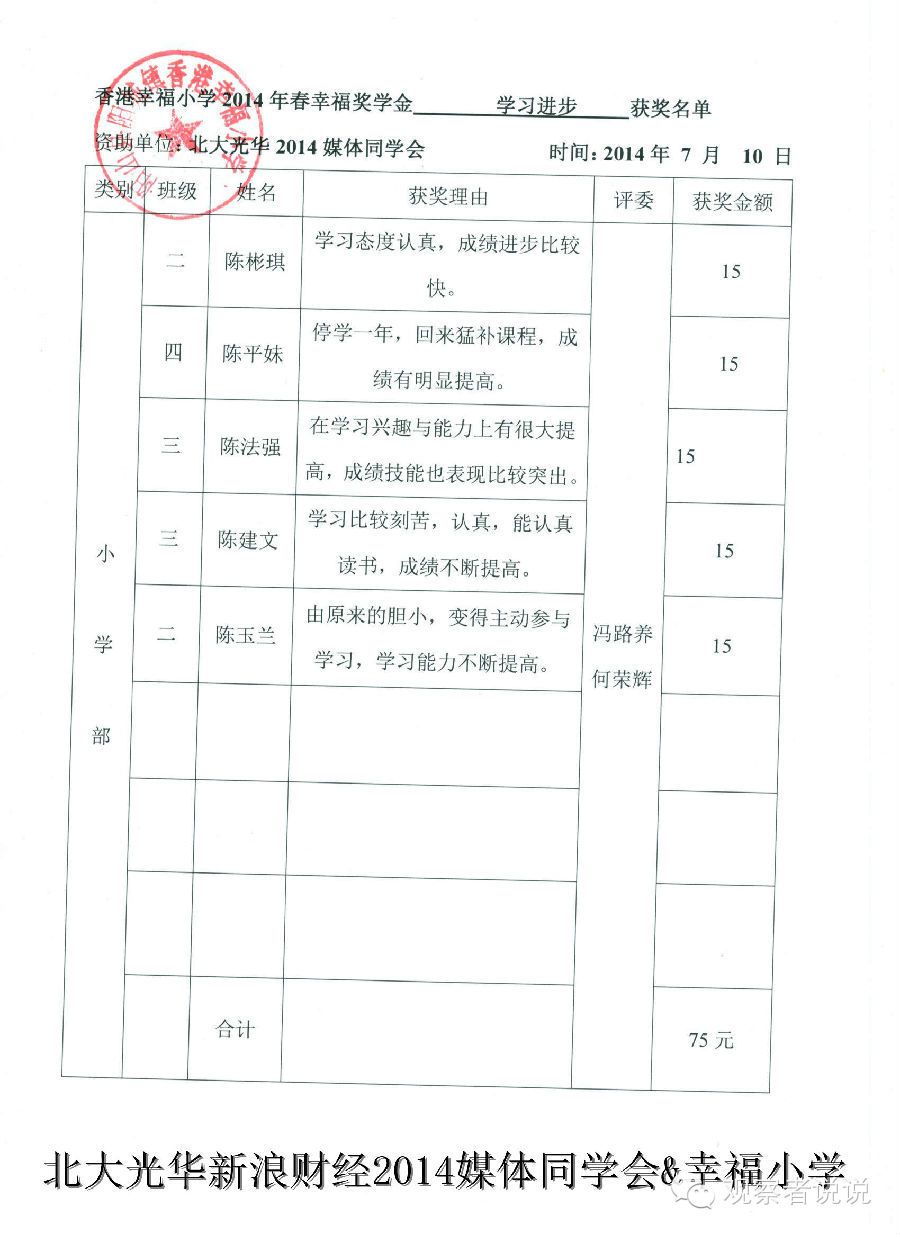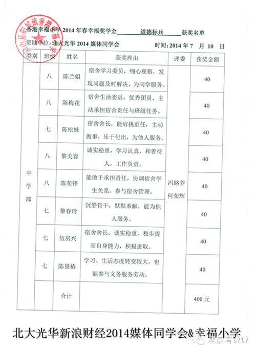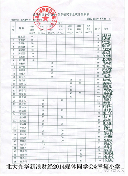 亲爱的同学朋友们,由“北大光华2014媒体同学会”捐出班费为贫困山区学校设立专项奖学金——“幸福奖学金”,7月上旬已经正式发放。我们这批同学,来自全国各地重磅媒体中高层甚至顶层(除了我拖后腿以外),有幸从500名候选人中获得到了40多个2014年“北大光华—新浪财经媒体奖学金”资格,并且在北京光华管理学院封闭学习了一整周时间,收获真的是很多很多特别多啊。感恩感谢之情不多说,我们同学拿出全部班费,并且商量着会决定持续注入,以公益行动回报社会更有需要的孩子们,协助他们稍稍改善学习条件,激励他们努力通过学习知识,掌握改变自己未来命运的钥匙。