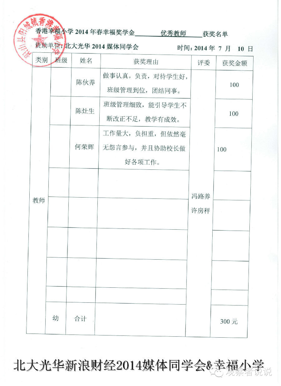 2、小学本部期末考试优秀奖、进步奖、道德标兵奖。3、山区就读中学学生期末考试优秀奖、道德标兵奖。4、优秀教师奖励)。奖学金覆盖50%左右的学生和优秀老师。基本上每个项目的奖学金也就几十块钱。有过几年的公益助学实践经历,加上与当地志愿者的交流沟通,我知道,这可能是对山区学校孩子们莫大开心快乐骄傲的事。为确保监督审议程序合规,此次奖学金评审委员会由幸福小学两人、媒体班同学三人(戴远程,鲁军,温霞)组成,我们商量着,先试行一年两个学期。看效果,我们会持续发放幸福奖学金。