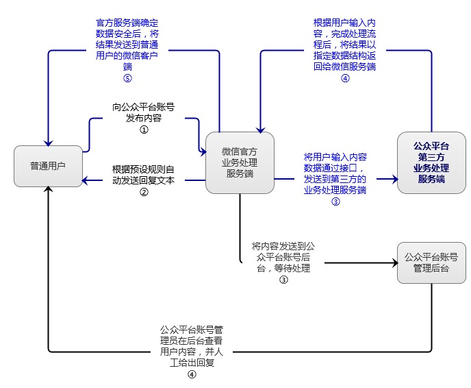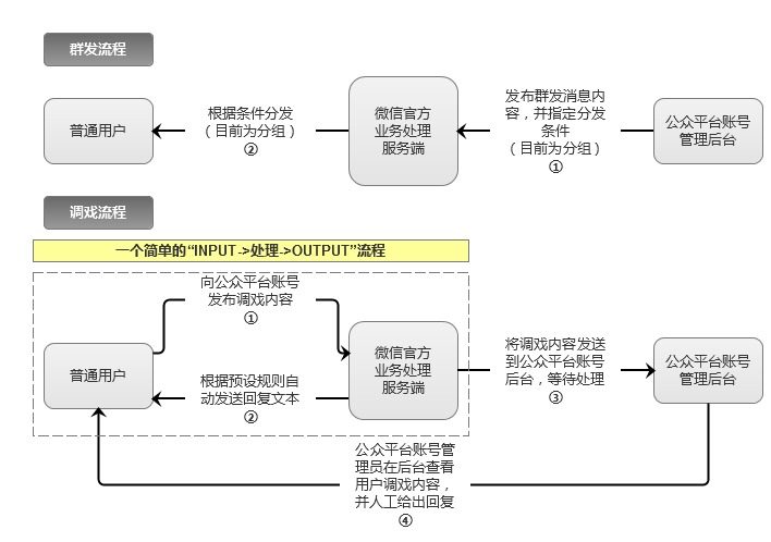 正如图中所示,其实普通用户向公众平台账号发送一条消息,公众平台账号在人工处理这条消息前,系统根据预设规则自动发送的回复,就是一次简单的“输入->处理->输出”的处理流程。