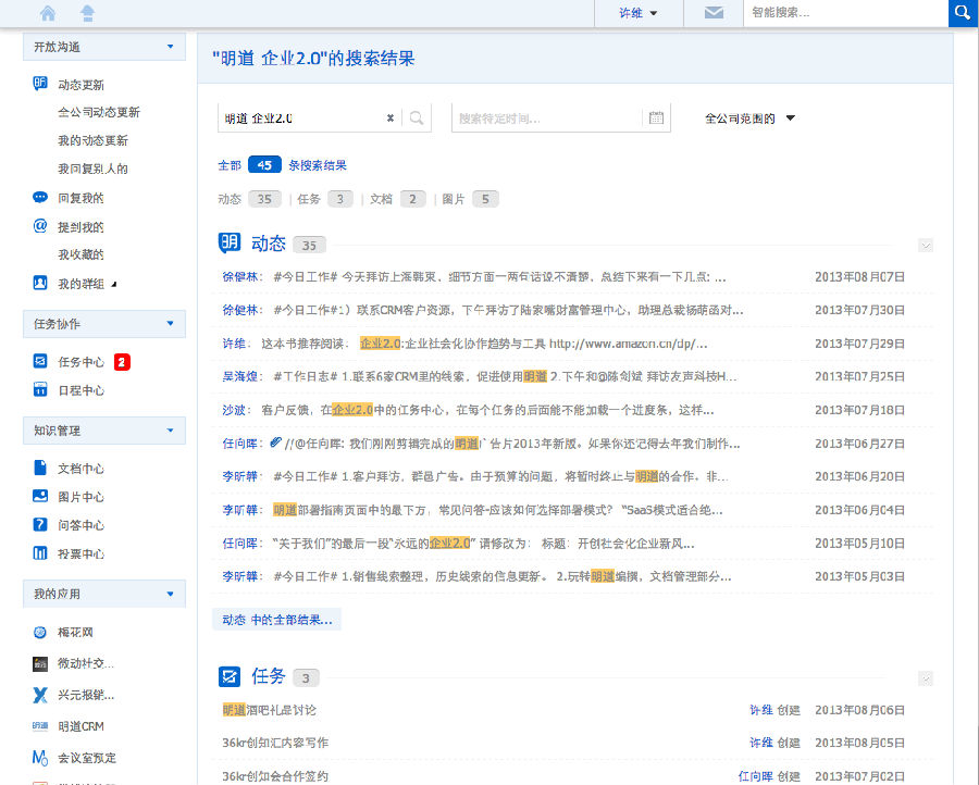 http://mmsns.qpic.cn/mmsns/etYcMll13ficiaZL92WMphHPk6Vx3jMnN4gk8ojnhvNC6iaRTFAMbDmrQ/0利用关键词搜索功能,企业可以快速查询以往的信息。(此图为明道web版本)