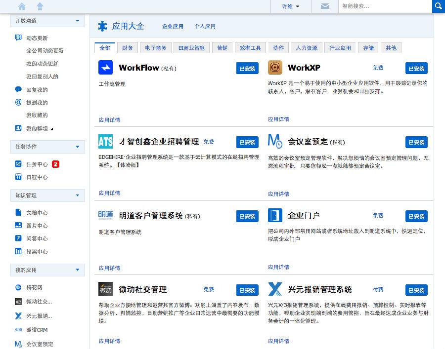 但是在企业2.0的环境下,知识管理是社会化的,每个成员都可以上传文件到文档中心、图片中心,每个成员都可以对文档添加标签,每个成员都可以对文档内容发表自己的评论,如此一来,这个文档中心就变得活起来了。而且,管理者还可以把其中的精华文档加入“知识门户”,用树状目录进行管理,让这些文档变得有序和可用。有了知识门户的沉淀,新员工的培训就不再是一件困难的事情了。