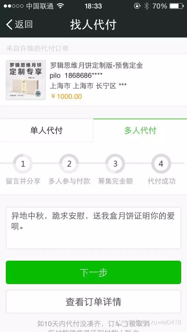 但是那一天我们发现199元确实成本有点高,还有一些人,他一下子下单十盒,人家一看说十盒,1990呀,还不如请他吃顿饭呢。于是我们很快花了三四天的做了一个新的功能,可能有的人管它叫众筹,我们叫多人代付,你下单以后,你可以让很多朋友一起来帮你付,一个人付一点。