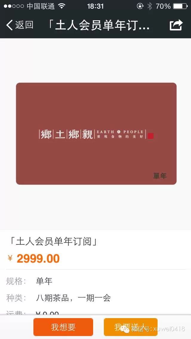 乡土乡亲是卖茶的,他们更会玩。乡土乡亲最早在淘宝京东上卖,卖了一年多,不行,后来他们把整个淘宝店放弃,开始在微信平台上玩。他的玩法很简单,就是玩会员制,2999一年的会员,每个月给你派一次茶,你不用管我给你派的是什么茶,只要你相信我,我会找到最好的茶叶,他每个月会派一次。上个月是两盒茶叶,加上一盒用茶叶炒的西瓜子。除了这些他们还做一些线下品茶等等一些活动,我们就会发现,用会员制去卖茶,同时去根据季节,去根据不同的人群,去做定制性的包装非常好。