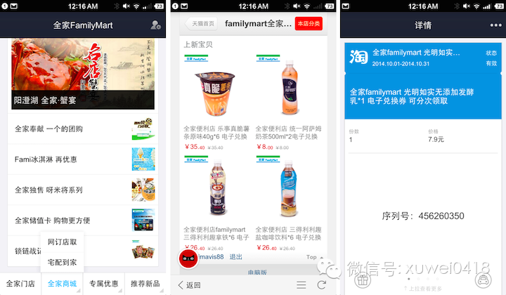 第一个例子是支付宝的全家便利店服务窗(服务窗其实和微信服务号非常类似,换了个名字而已),它有一个“全家商城”类目,点进去有“网订店取”、“宅配到家”两个选项,我点击“网订店取”以后进入了一个天猫商城店铺,成功购买某项商品后,我得到了一个电子券,这是一串数字代码,我可以到店铺去把东西换走。