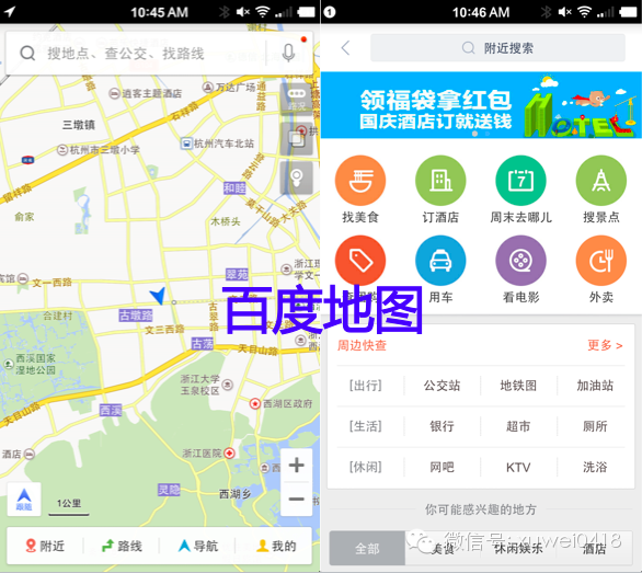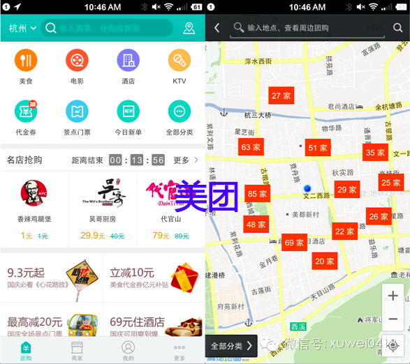 也许有些爱思考的读者会说:“不一定啊,我用团购软件去找店的。”那么请大家对照一下下面两张图:第一张左边是百度地图首页,右边是点击“附近”进入的商户类目页面;第二张左边是美团网的首页,右边是点击“地图”进入的地图页面。怎么样,是不是感觉二者只是换了一下顺序而已?