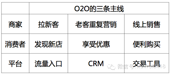 在我的逻辑框架里,O2O包括三个主体——商家、消费者、平台。商家、消费者各自有三大需求,商家的需求是“新客营销、老客营销、交易”,消费者的需求是“发现新店、享受优惠、便利购买”。商家和消费者的这三大需求其实是一个硬币的两面,对应着平台方的三大产品,分别“流量入口、CRM、交易工具”。