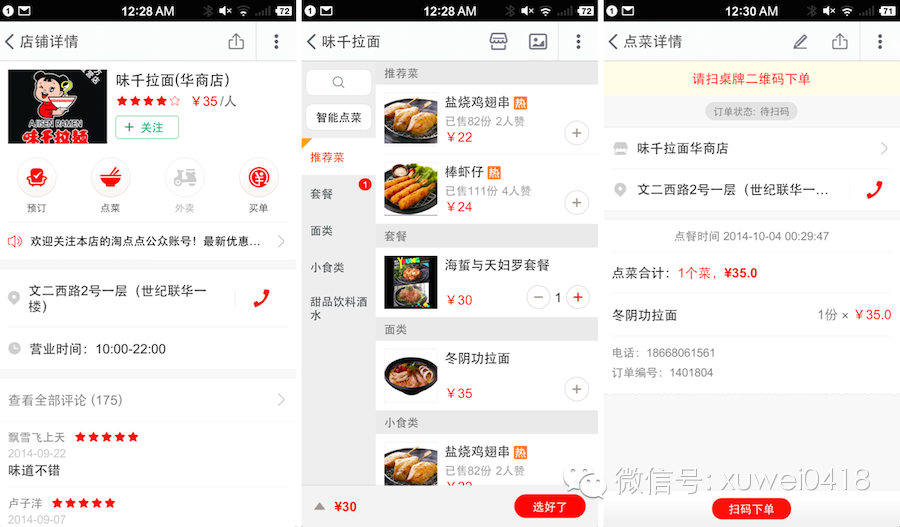 第二个例子是淘宝的淘点点,合作的商家可以把菜谱上传上来,消费者可以在手机上直接把菜点好,然后到店以后,扫描所在桌位的二维码就可以下单了,消费结束之后,也可以直接用手机扫码支付。如果是外卖的话就更省事,在手机上点好,付款,然后等着送货就ok。